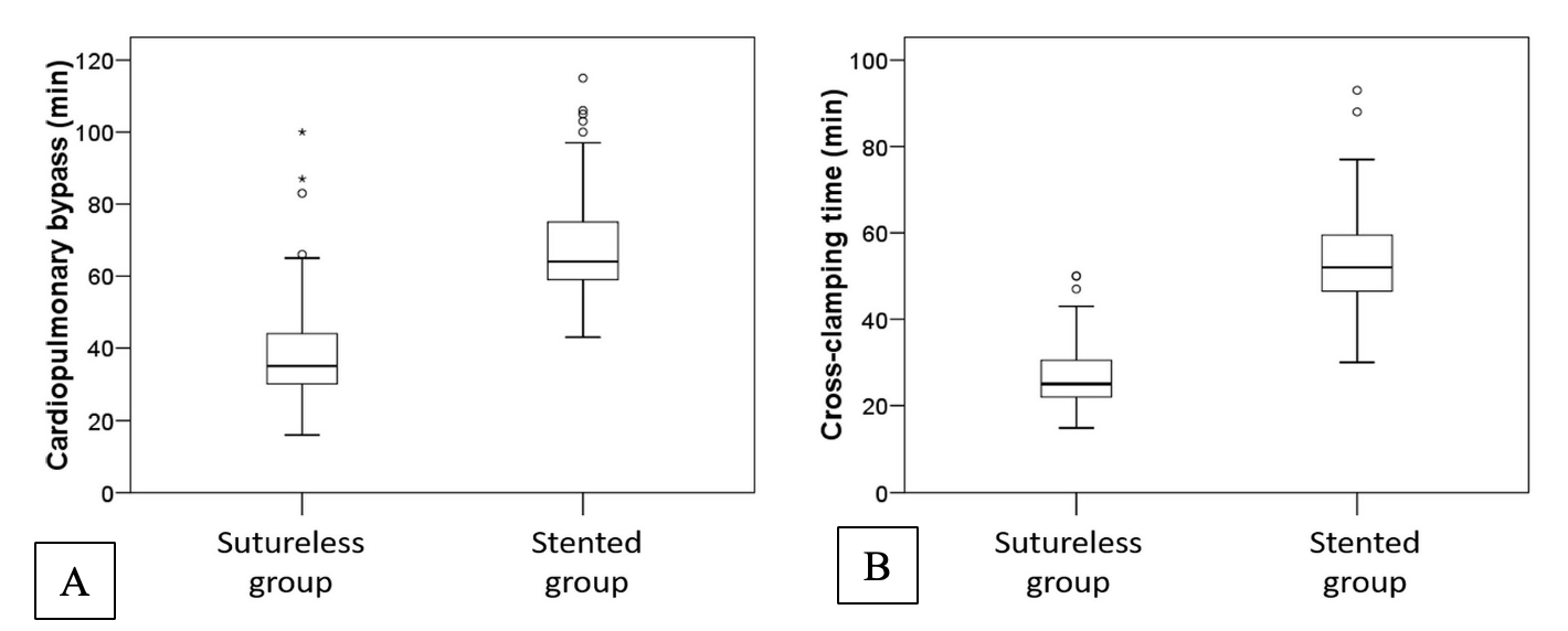 Background and aim of the study: Minimally invasive approaches for aortic valve replacement (AVR) are clinically beneficial for patients but are more technically demanding for surgeons. Sutureless AVR is a new and minimally invasive approach. The study aim was to evaluate initial AVR outcomes in patients aged >75 years after setting up a sutureless minimally invasive surgery program. Methods: Between January 2014 and December 2015, a total of 108 patients aged >75 years with indication of isolated elective AVR received a sutureless bioprosthesis using the minimally invasive approach (sutureless group). The latter group was compared with a second group of patients (n = 115) who received a stented valve through a full median sternotomy (stented group) at the authors’ institution between January 2012 and December 2013. After propensity score matching, 95 pairs of patients were available for analysis. Results: Preoperative demographic variables were similar between the matched groups. The aortic cross-clamp (ACC) and cardiopulmonary bypass (CPB) times were each shorter in the sutureless group (p <0.01). Perioperative mortality was 1% in the stented group, but no mortality occurred in the sutureless group (p = 0.32). Early postoperative extubation, intensive care unit and hospital stays, need for transfusion, and overall hospital stay were lower in the sutureless group. Frequency of pacemaker implantation was higher in the sutureless group than in the stented group (8.3% versus 1.9%; p = 0.05). Aortic transvalvular gradients were lower in the sutureless group (p = 0.01). Conclusion: In the authors’ experience, the sutureless aortic valve was a useful tool for establishing a minimally invasive AVR program. The technique was safe, and the shorter ACC and CPB times increased the likelihood of early extubation, reduced the need for blood transfusions, and demonstrated good hemodynamic performance. Patients who underwent sutureless AVR showed an increased need for pacemaker implantation.